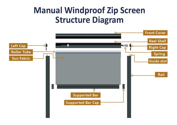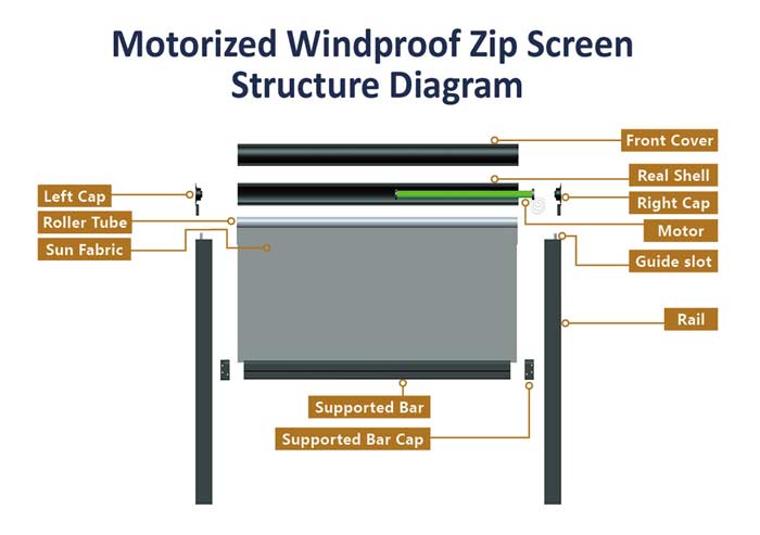 We use an aluminum alloy frame and an integrated guide rail system to ensure that our smart windproof zip screens operate smoothly and remain stable during movement. The materials are of superior grade, highly colorfast, and exceptionally durable, providing effective wind protection